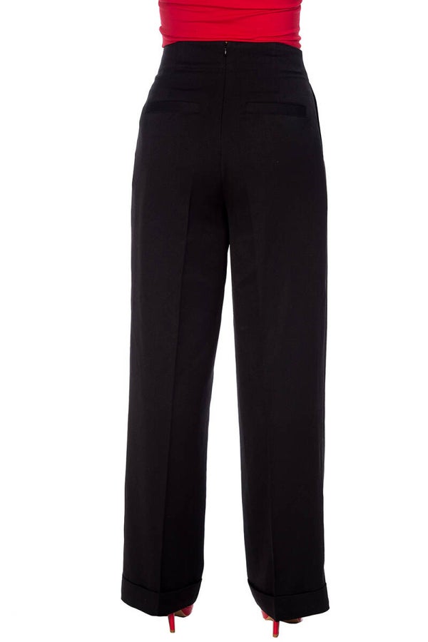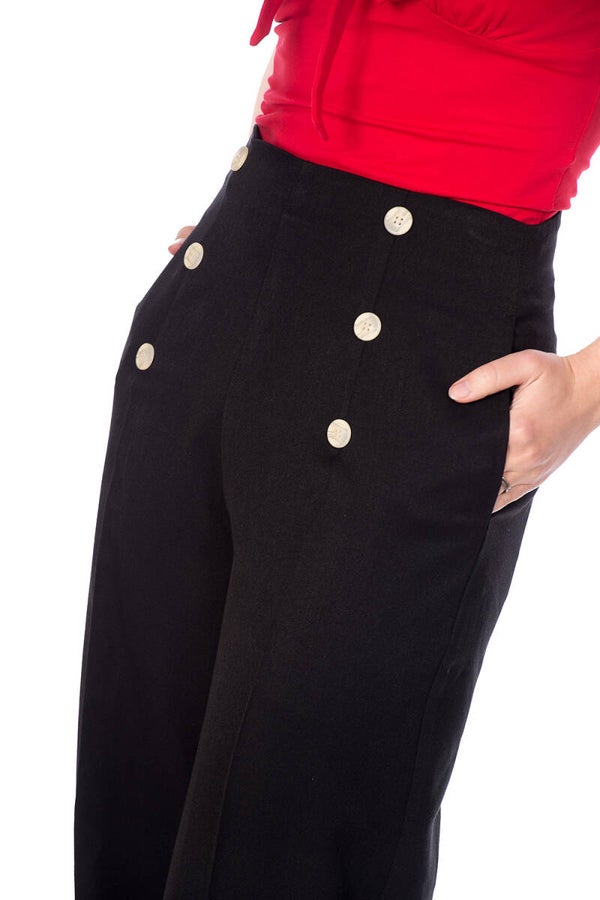 Aventures Ahead Pants van Banned is een super mooie broek met een vintage look. Een echte klassieker met een high waist en wijduitlopende pijpen. De knopen geven een hint naar de jaren 50, maar de broek sluit vanachter door middel van een rits.