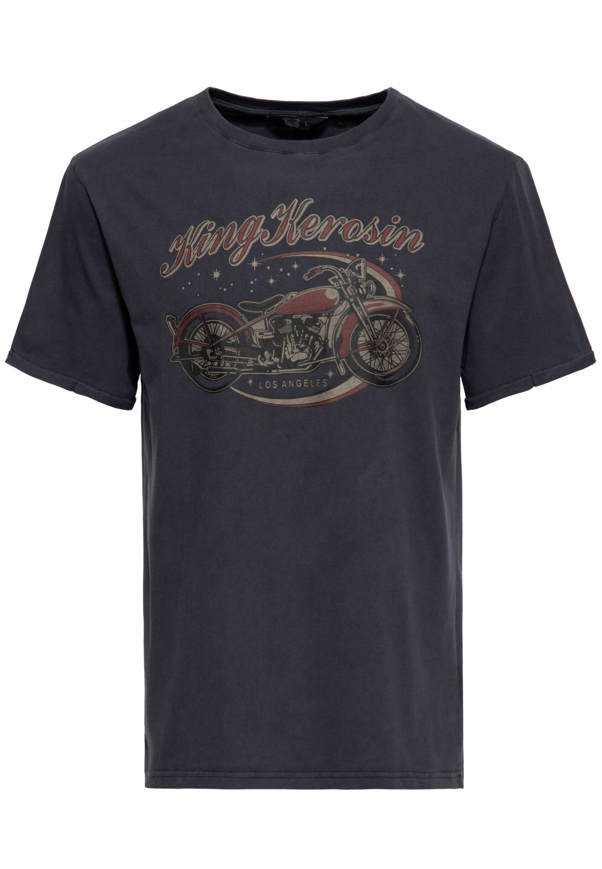 De Bopper is een mooi t-shirt van King Kerosin met een Vintage feeling en gave print van een 50's motor erop. De verwassen zwarte kleur geeft een extra vintage gevoel aan het shirt.