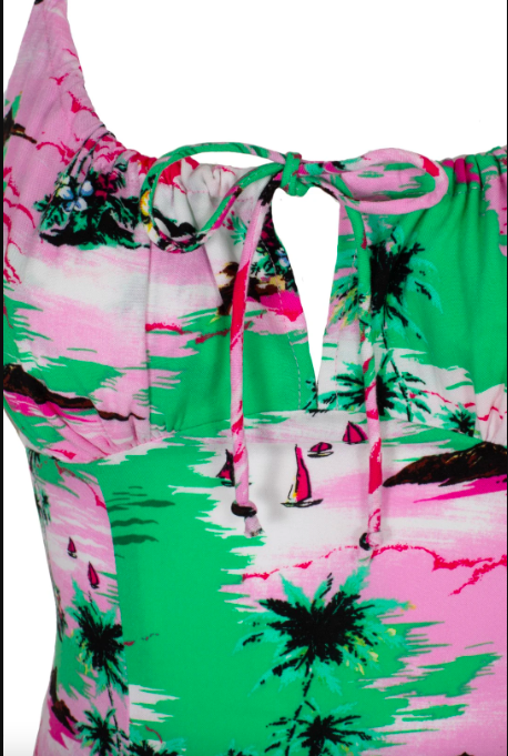 De Kai Knee dress van Hell Bunny is een heerlijk zomers jurkje met een tropisch thema en 50's look . Deze beauty is gemaakt van viscose voor een heerlijk draagcomfort tijdens de warme dagen. De print van een tropisch eiland wordt geaccentueerd door de kleuren roze en groen en met een lengte van boven de knie is het echt een mooi zomers jurkje.