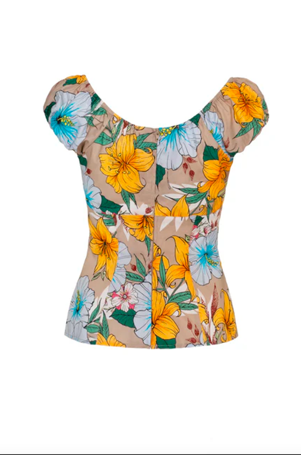De Pattaya Top van Hell Bunny is een mooie zomerse top met een prachtige bloemenprint. De top heeft een echt 50's model met een goede taille en mouwtjes met elastiek die zowel te dragen zijn op als over de schouders. De top sluit met een doorlopende rits aan de achterkant en heeft knoopjes aan de voorkant als extra accent.