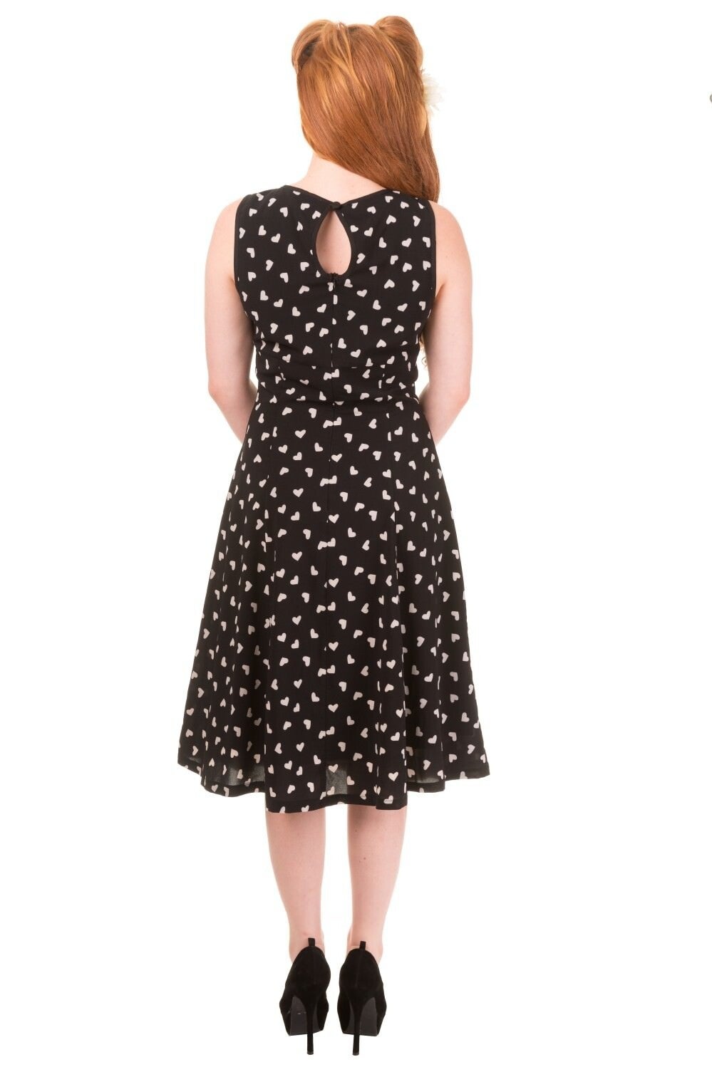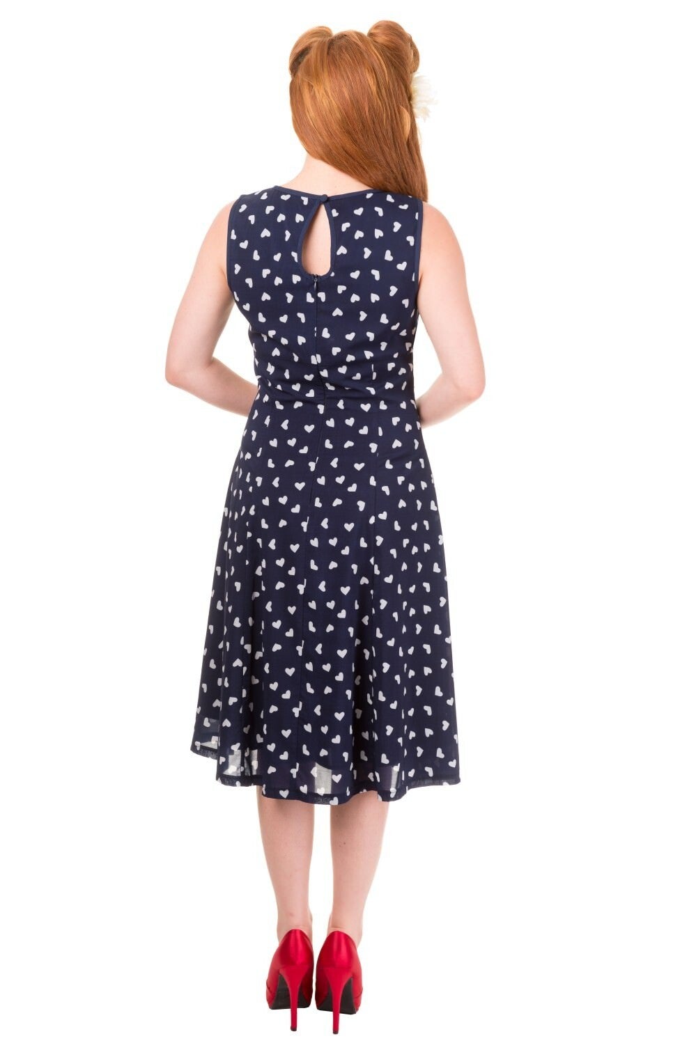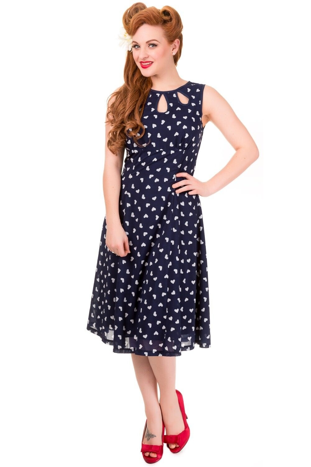 Deze beauty van een vintage-inspirerende jurk is een echte blikvanger. De jurk heeft een diepe navyblauwe kleur en heeft een leuke print van kleine, witte hartjes. Het model heeft een mooie A-lijn, valt heel lichtjes en heeft een lengte tot over de knie.