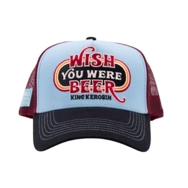Wish You Were Beer! Deze toffe cap met subtiele tekst is van het merk King Kerosin. De kleurencombinatie van blauwe met donkerrood geef de cap een goede vintage look.