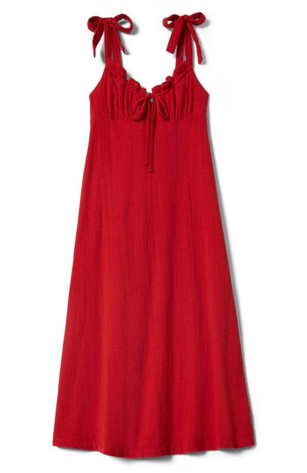 Deze beauty heeft een prachtige rode kleur, is bij de schouders te verstellen naar wens en gaat bij elke keer dragen nog lekkerder zitten. De jurk is gemaakt van 100% katoen en voelt heerlijk zacht aan. Het keyhole detail geeft de jurk net wat meer body. Daarnaast is de jurk aan de achterkant gesmockt om goed aan te sluiten op je figuur.