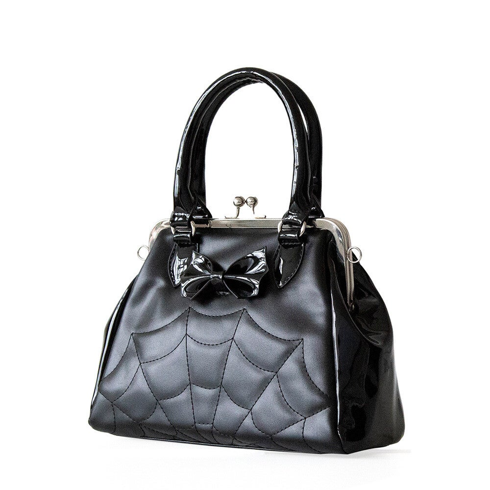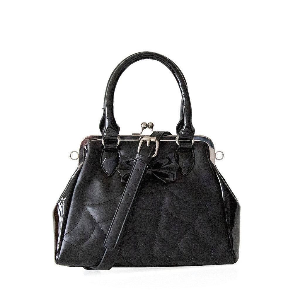 Deze beauty heet niet voor niks Femme Fatal, want wat is ze prachtig en duister tegelijk. De Femme Fatal handtas heeft prachtige curves in lak, een mat spinnenweb patroon met matchend strikje en een klassieke fifties sluiting. Binnenin zit een verborgen vakje met rits en nog 2 extra vakjes voor eventueel je telefoon en nog wat anders.